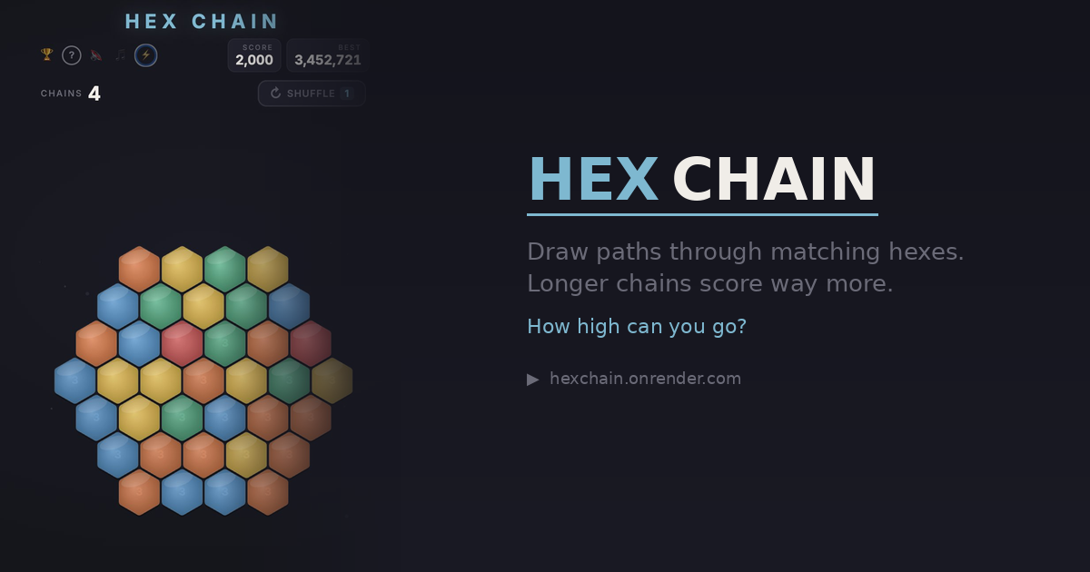 Chains of 3 or more clear and score. Longer chains score way more: a 6-chain is worth 10x a 3-chain!